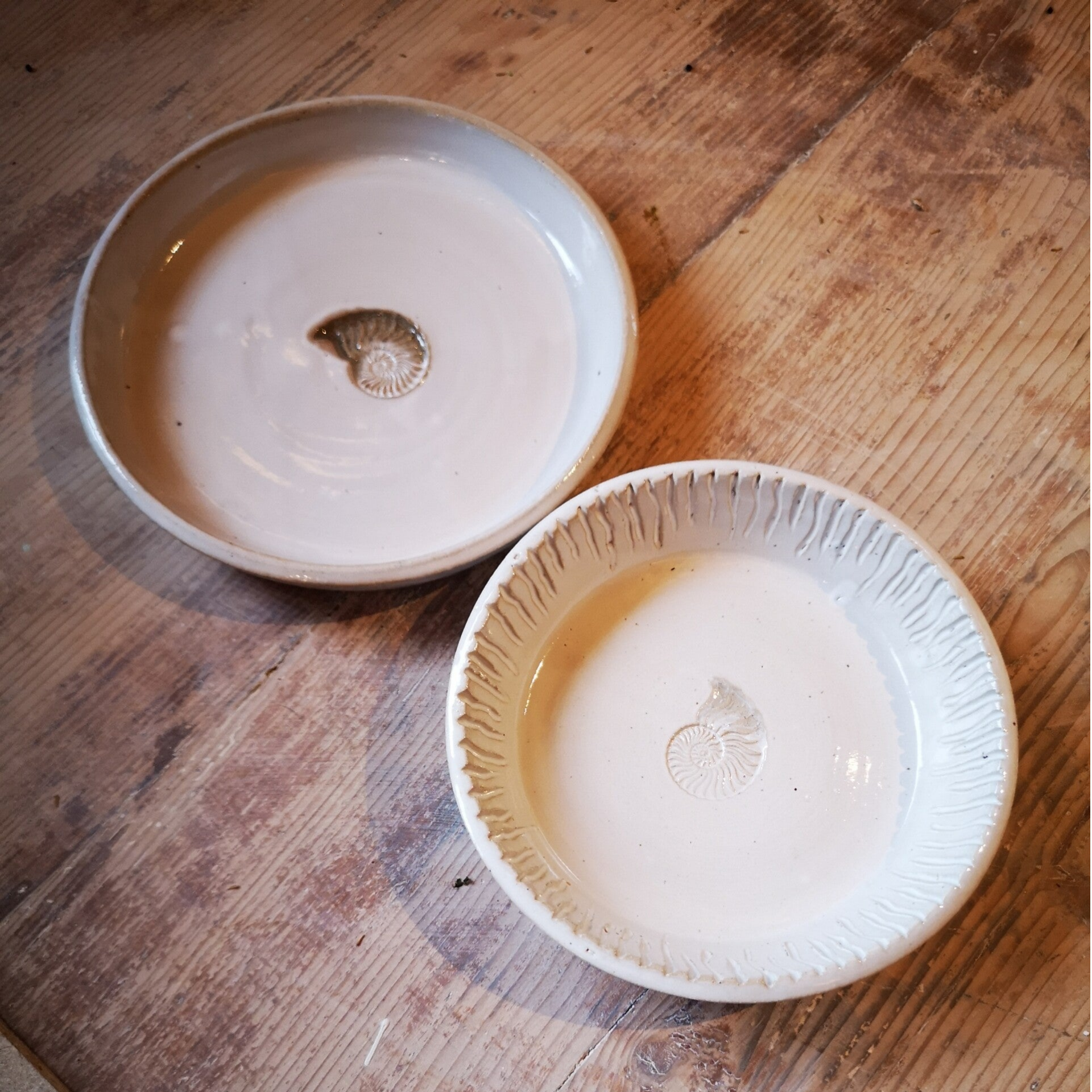 Die Pflanzenteile werden auf dem Ton platziert und übermalt, erst später wird transparent glasiert. Auf diese Weise können entsprechend der Jahreszeiten jegliche Blütten und Blätter konserviert werden.
